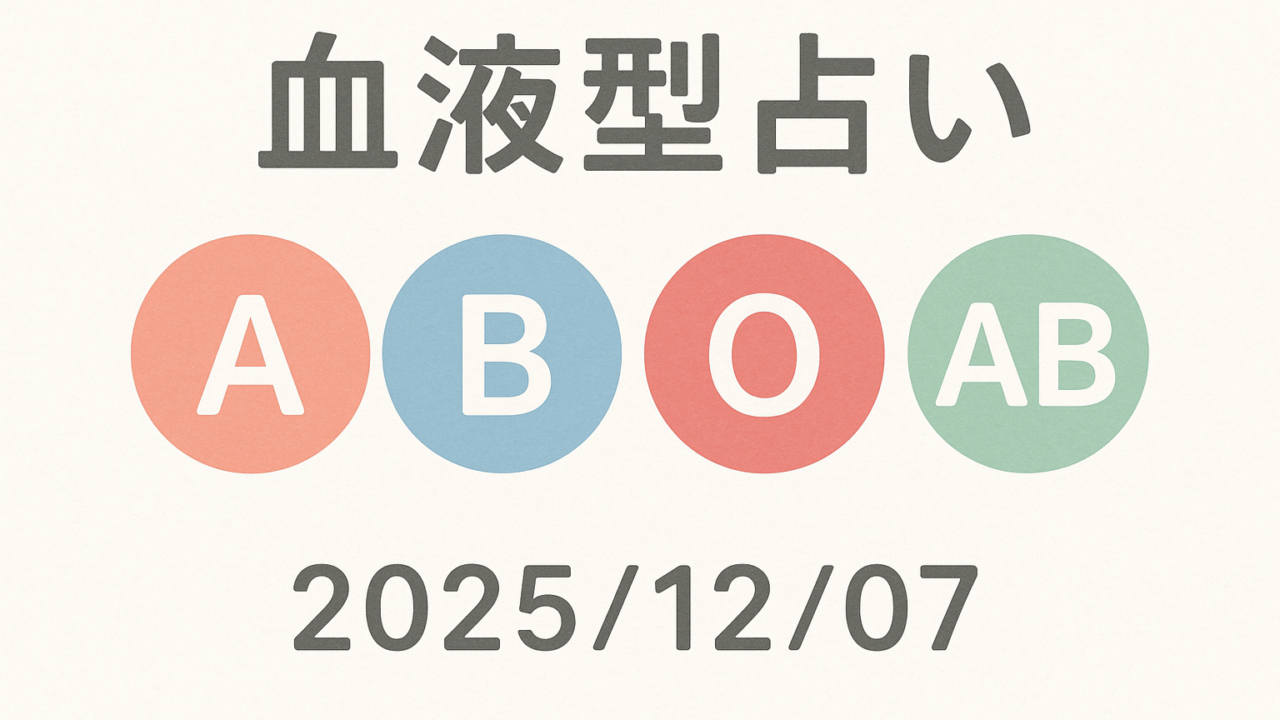 今日は2025年12月7日。寒さが増し、年末の雰囲気が漂ってきましたね。では、各血液型の運勢を見ていきましょう!今日は血液型別にランキング形式でお届けします。皆さんの今日の運勢をチェックしてみてください!