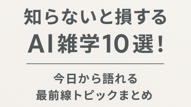 AI 知らないと損するAI雑学10選!今日から語れる最前線トピックまとめ 2025年11月16日 AI 生活向上AI AIの話題は日々刷新され、知らないだけで設計ミスやコスト増につながる“落とし穴”も増えています。ここでは、今日から語れて実務にも刺さる最前線 …